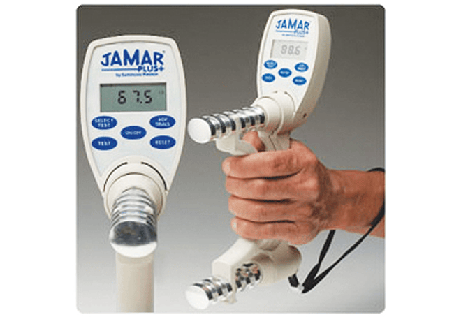 El dinamómetro de mano digital Jamar ofrece lecturas precisas y repetibles de la fuerza de agarre para la detección de rutina de la fuerza de agarre y la evaluación inicial y continua de los clientes con trauma y disfunción en la mano. Tiene una pantalla LCD fácil de leer. También tiene una consola de pulsadores que incluye un botón para poner a cero la última lectura almacenada. Registros en libras y kilogramos