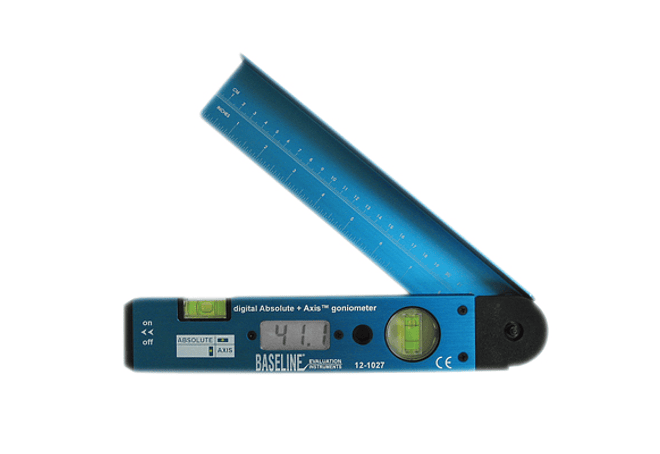Baseline® digital Goniómetro Absolute + Axis® - Escala LCD de 180 grados - Los brazos de 9 pulgadas tienen niveles Absolute + Axis® integrados. Alimentado por 1 x batería de 9v, incluido. El goniómetro Absolute + Axis® (AA) establece un "verdadero" vertical u horizontal al punto de inicio de una medición. Muchas mediciones goniométricas requieren que un brazo del goniómetro se coloque horizontal o verticalmente. El otro brazo se alinea con la parte del cuerpo del paciente. Hasta ahora, el practicante tenía que "asumir" o "globo ocular" la posición vertical u horizontal. Esta interpolación es a menudo incorrecta e introduce un error de medición. El goniómetro Absolute + Axis® elimina la variabilidad de la medición y permite al profesional concentrarse en la colocación correcta del otro brazo del goniómetro y la posición del cuerpo del paciente. Algunas medidas que el goniómetro AA está diseñado para mejorar son: rotación de hombro y cadera (interna, externa); flexión cervical, extensión, rotación y flexión lateral; flexibilidad de los isquiotibiales; y ROM activa.