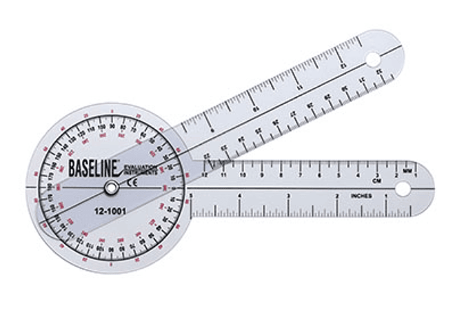 El goniómetro de plástico transparente permite observar el eje de movimiento de la articulación y su rango de movimiento. La cabeza de 360° tiene tres escalas calibradas para ser utilizadas con el sistema ISOM (Normas Internacionales de Medición, STFR). El brazo tiene una escala lineal en pulgadas y centímetros y permanece en la posición de medición hasta que se reinicia. La escala del ángulo lee incrementos de 1°.